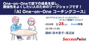 - 【2026年2月28日】『AI One-on-One コーチングコース』One-on-Oneで部下の成長を促し、関係性をよくしたい人のためのワークショップです。AI(アプリシエイティブ・インクワイアリー)は人の価値をみつけ、その価値を活かして未来に向かって進みます。その手法は世界で広くAIコーチングとして利用されています。 そのAIコーチングを日本のビジネスの場面に最適に使えるように「日本化」してお届けします。