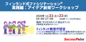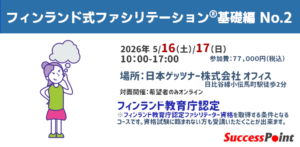 - 【2026年5月16日・17日】 フィンランド式ファシリテーション®基礎編NO.2No1に引き続き、このコースでは参加メンバーから知恵を引き出すファシリテーションを企画し運営する方法を学びます。 基礎編の前編と合わせてこの後編を学ぶと、フィンランド式ファシリテーション®の主な構成やツールを学ぶことができます。