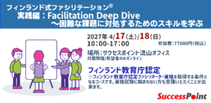 - 【2027年4月17日・18日】 フィンランド式ファシリテーション® 実践編:Facilitation Deep Dive 困難な課題に対処するためのスキルを学ぶファシリテーターが直面する様々な困難な課題や場面を取り上げつつ、それらに対処する方法を共に考えるコースです。 15のツールを駆使しながら、様々な困難な課題をクリアする方法を学びます。