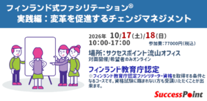 - 【2026年10月17日・18日】 フィンランド式ファシリテーション® 実践編:変革を促進するチェンジマネジメント組織内に変革を起こす際に起きる抵抗の気持ちをやわらげ、対話により変革を促進する際に必要なツールと変革プロセスを学びます。