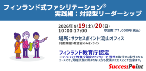 - 【2026年9月19日・20日】 フィンランド式ファシリテーション® 実践編:対話型リーダーシップこのコースは会議運営を効果的に行うためのノウハウが詰まったコースです。メンバーの意見を引き出し、メンバーと共に決定することで、やる気を引き出し、目標に一丸となって向かうチームをつくります。また、メンバーが考える場を創り出し、著しい成長を促します。