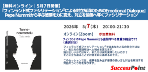- 【2026年6月6日・7日】Pepeから直接学べるフィンランド式ファシリテーション®実践編:Conflict Resolution 対立を乗り越え、協働と成長を生み出す職場へ会議において、感情が絡み合い、話し合いが対立し、平行線になりやすい、そんな「難しい対話」を解消するファシリテーションがテーマです。フィンランド式ファシリテーション®の考え方と実践を通して、会議における対立を乗り越え、協働と成長につなげていく進め方を学びます。会議において対立した状況でも対話を前に進めるための視点とプロセスを体感して、「対立した状況が起きても大丈夫!」と自信を持てるファシリテーターを育成する2日間です。